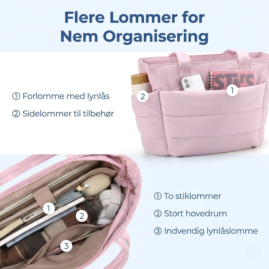 Oplev følelsen af ultimativ frihed med denne fjerlette puffer-taske, der er skabt til at svæve gennem din dag med dig. Med sit unikke sky-design sikrer den dig både uovertruffen komfort og en gennemført stil, uanset hvor travlt dit program er, eller hvor din næste weekendudflugt fører dig hen.